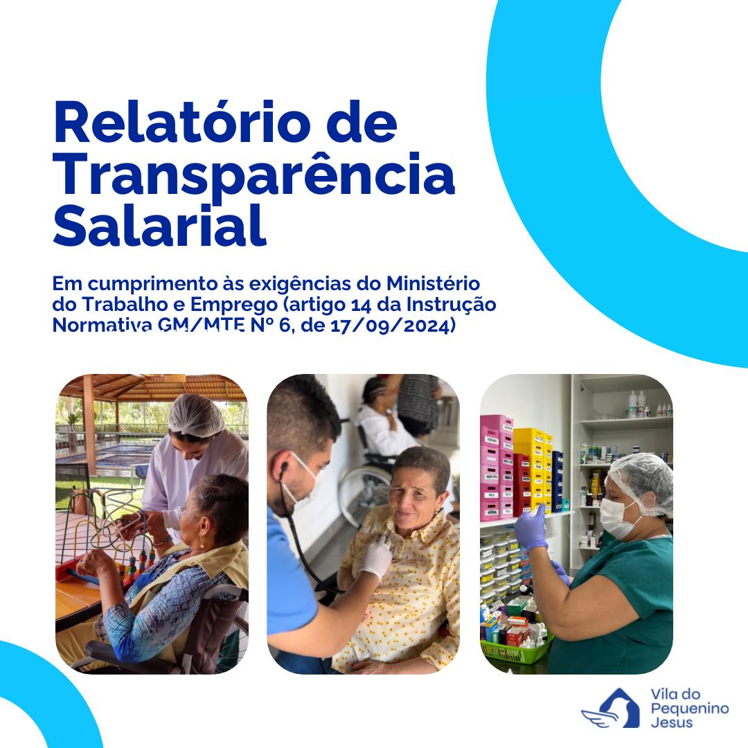 A Vila do Pequenino Jesus, em cumprimento às exigências do Ministério do Trabalho e Emprego (artigo 14 da Instrução Normativa GM/MTE Nº 6, de 17/09/ 2024), divulga nesta terça-feira (30/09), o Relatório de Transparência Salarial e de critérios remuneratórios entre mulheres e homens contratados pela instituição.